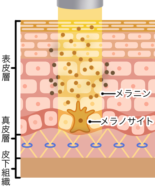 レーザーエネルギーを受けたメラニンのかたまりは、分解され消失し、お肌の表面上にはシミは見えなくなります。